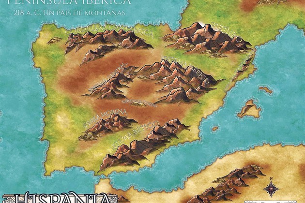 Mapa orográfico de la Península Ibérica en el siglo III a. C. En la parte superior, a la izquierda, en la configuración de la costa atlántica, el Finisterre es la primera saliente entre las principales. En la parte inferior de la carta, donde se rozan Europa y África, el Estrecho de Gibraltar es el lugar de encuentro del océano Atlántico con el mar Mediterráneo (en rigor una misma masa de agua), mítico lugar en el que se levantaban las Columnas de Hércules. Al sur, en la costa norafricana, la cordillera del Atlas corre paralela a la cadena montañosa del sistema bético en la Andalucía española.Mapa orográfico de la Península Ibérica en el siglo III a. C. En la parte superior, a la izquierda, en la configuración de la costa atlántica, el Finisterre es la primera saliente entre las principales. En la parte inferior de la carta, donde se rozan Europa y África, el Estrecho de Gibraltar es el lugar de encuentro del océano Atlántico con el mar Mediterráneo (en rigor una misma masa de agua), mítico lugar en el que se levantaban las Columnas de Hércules. Al sur, en la costa norafricana, la cordillera del Atlas corre paralela a la cadena montañosa del sistema bético en la Andalucía española.