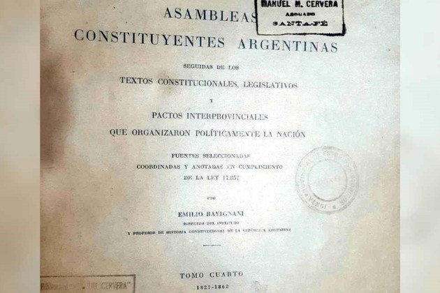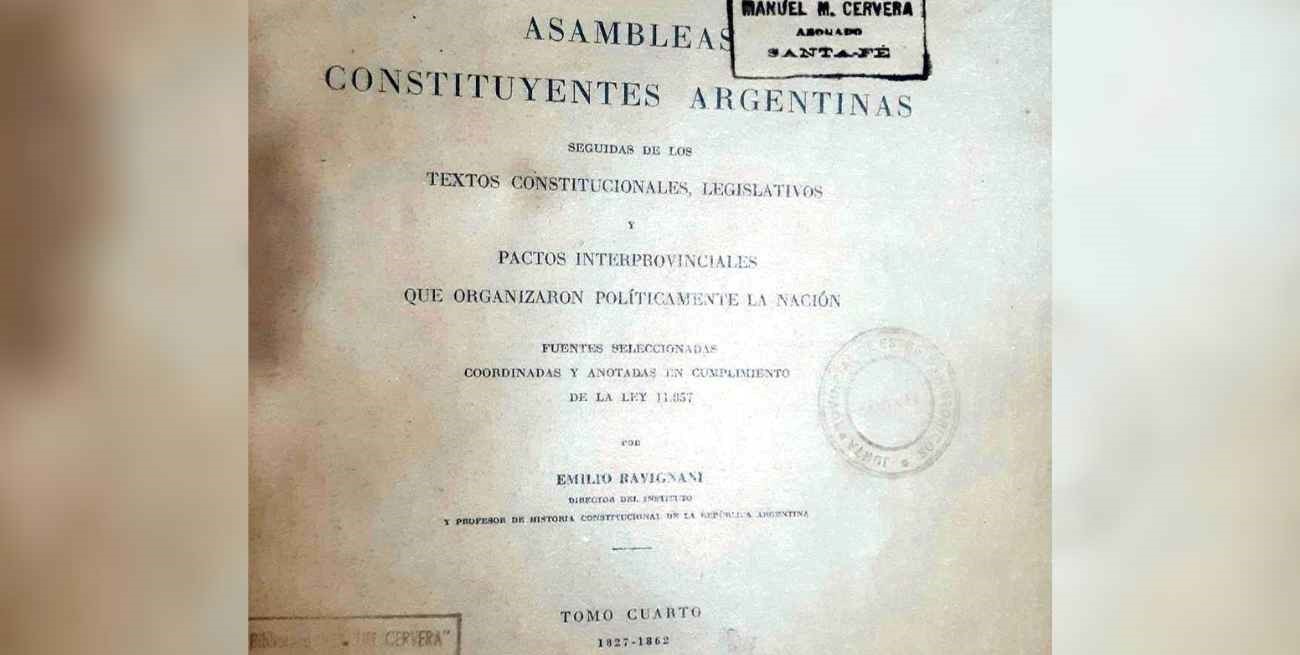 Portada del tomo cuatro de la obra titulada "Asambleas Constituyentes Argentinas", de Emilio Ravignani. Biblioteca de la Junta Provincial de Estudios Históricos.