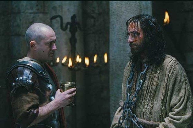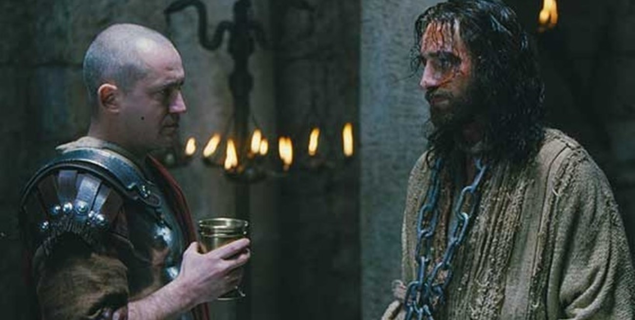 Momento del filme "La Pasión de Cristo", de Mel Gibson, en el que el prefecto romano Poncio Pilato (Hristo Shopov) interpela y cuestiona a Jesús de Nazaret (Jim Caviezel). Recreación cinematográfica