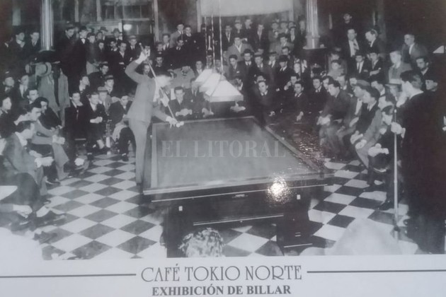 Tomo un café y me acerco a la foto que está en la pared al lado de la barra. Son dos fotos en realidad tomadas con una escasa diferencia de tiempo. Dos fotos en riguroso blanco y negro. Fotos algo ajadas por los años pero limpias. El escenario es el bar y una mesa de billar. En ese lugar está Ezequiel Navarra con el taco a punto de realizar un tiro "masse". Al frente, un jovencito que le da la espalda al fotógrafo aunque se alcanza a distinguir algunos rasgos de su perfil. Está parado, con el taco en la mano y espera. Es Enrique, Enrique Navarra, el menor de los tres hermanos. Alrededor de cien personas desparramadas alrededor de la mesa, a una distancia de no más de tres metros, miran con atención. En la primera fila, están todos sentados. Después, todos de pie. En la otra foto , el mismo escenario. Pero ahora Ezequiel está algo agachado mirando seguramente los espacios que dispone para hacer su juego. La mano derecha apoyada en el paño. ¿La fecha?. Agosto de 1938. El año que dos de los hermanos Navarra anduvieron por estos pagos. Cinco años antes, Carlos Gardel nos visitó a los santafesinos. ¿Por qué lo menciono? Porque con las diferencias del caso, los Navarra eran algo así como los Gardel del billar. Ochenta y dos años después yo estoy allí anotando detalles que registran ese momento que quedó congelado para siempre, ese momento que seguramente dispone de un pasado y un futuro inmediato. Me encantan esas fotos. El presente como instante cargado de historia.