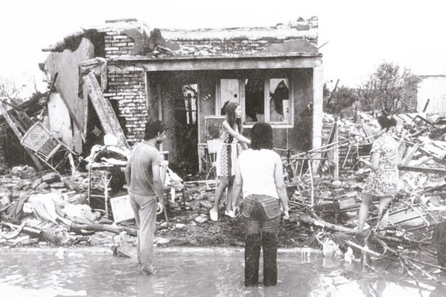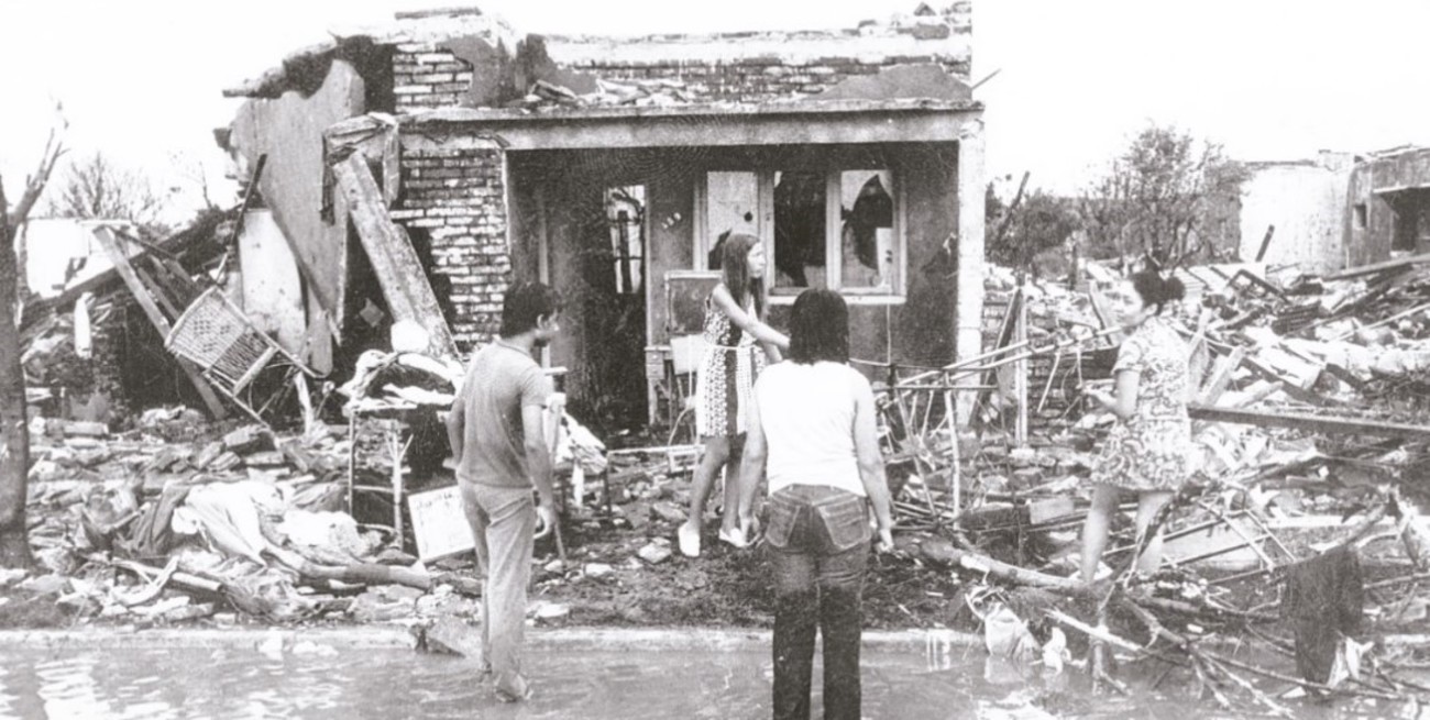 La voz del locutor informa: "En apenas minutos, el viento furioso arrasó con casas, vehículos, silos de granos. Ya se llevan contados cuarenta muertos y cientos de heridos. Habría más personas bajo los escombros (…)"