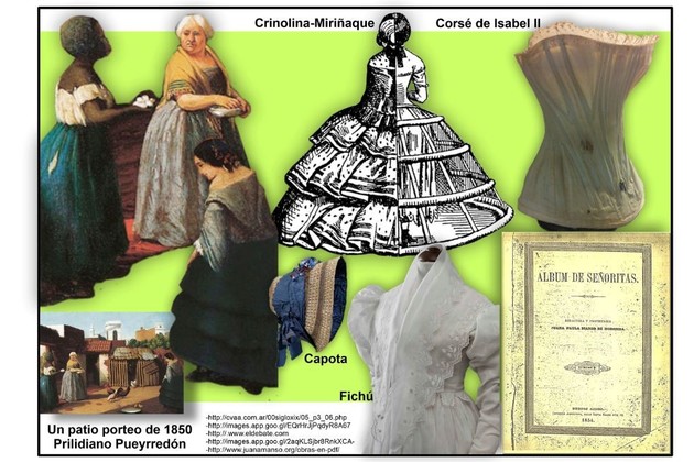 Las telas usadas eran paños rústicos, en su mayor parte importados de la industria textil inglesa, porque con la apertura al comercio internacional, la manufactura local del tejido, sobre todo de Catamarca y La Rioja, estaba declinando. La pintura de Prilidiano Pueyrredón "Patio porteño en 1850" registra, en una escena de la vida cotidiana, el contraste social de las vestimentas entre tres mujeres: "(…) la sirvienta negra con los huevos, la señora tirando el maíz a las gallinas, la señorita de la casa mirando los polluelos". (Amigo, Roberto en https://www.bellasartes.gob.ar/coleccion/obra/3182/)