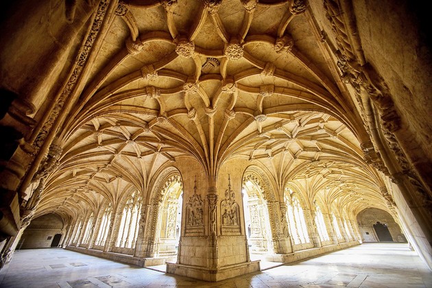 Galerías del claustro del monasterio de los Jerónimos en Lisboa. Los enlaces geométricos de las nervaduras de sus bóvedas son ilustrativas del estilo manuelino.