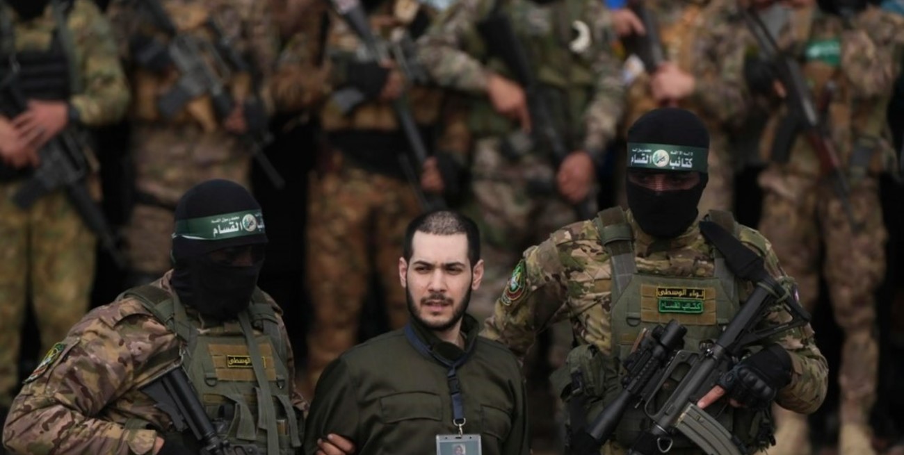 22 de febrero de 2025. Eliya Cohen, rehén retenido en Gaza desde el atentado del 7 de octubre de 2023, es escoltado por miembros del grupo Hamás mientras es liberado como parte de la primera fase del precario alto el fuego de principios de este año.