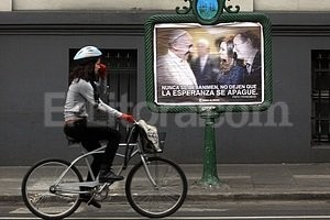 Los afiches de Cristina con Insaurralde saludando al Papa llenaron la ciudad de Buenos Aires. La generosidad de Francisco con la mujer que lo descalificó y maltrató cuantas veces pudo, no merecía ser retribuida con esta maniobra infame. Foto: DyN