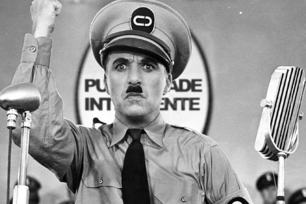 Algo semejante sucede en “El Gran Dictador”, cinta estrenada el 15 de octubre de 1940. Allí, Charles Chaplin ridiculiza -especialmente- al tirano Hitler y a otros dictadores de su talla. El argumento del filme se centraba en dos historias: la de un barbero que vivía en un gueto en un país imaginario llamado Tomania; y la del ambicioso líder de ese estado, el dictador Hynkel. ¡Ambos personajes son interpretados por el actor cómico! Tomania era una alusión a Alemania; Hynkel, a Hitler; y el barbero simbolizaba la víctima de la tiranía. Chaplin hizo que Hynkel y el barbero fueran físicamente semejantes para poder intercambiar sus roles, de tal forma que una casualidad hiciera que al final de la cinta el opresor fuera arrestado por sus soldados y el oprimido ocupara su lugar en el clímax del filme. Es la cinta en la que Chaplin “¡habla!” en contra de la opresión, de los totalitarismos y de la discriminación; en realidad, el barbero disfrazado de dictador es quien hace el siguiente discurso: “Pero... yo no quiero ser emperador. Ese no es mi oficio, sino ayudar a todos si fuera posible. Blancos o negros. Judíos o gentiles. Tenemos que ayudarnos los unos a los otros; los seres humanos somos así. Queremos hacer felices a los demás, no hacernos desgraciados. No queremos odiar ni despreciar a nadie. En este mundo hay sitio para todos y la buena tierra es rica y puede alimentar a todos los seres. El camino de la vida puede ser libre y hermoso, pero lo hemos perdido. La codicia ha envenenado las armas, ha levantado barreras de odio, nos ha empujado hacia las miserias y las matanzas. Hemos progresado muy deprisa, pero nos hemos encarcelado a nosotros mismos. El maquinismo, que crea abundancia, nos deja en la necesidad. Nuestro conocimiento nos ha hecho cínicos. Nuestra inteligencia, duros y secos. Pensamos demasiado, sentimos muy poco.”