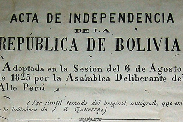 Y se lee entonces en la Proclamación de la Independencia de las provincias del Alto Perú, firmada el 6 de agosto de 1825: "(...) Se erige en Estado soberano e independiente de todas las naciones, tanto del viejo como del Nuevo Mundo y los Departamentos del Alto Perú, firmes y unánimes en esta tan justa y magnánima resolución, protestan a la faz de la tierra entera que su voluntad irrevocable es gobernarse por sí mismos y ser regidos por la Constitución, leyes y autoridades que ellos propios se diesen y creyesen más conducentes a su futura felicidad en clase de Nación".