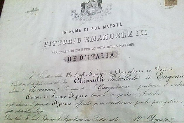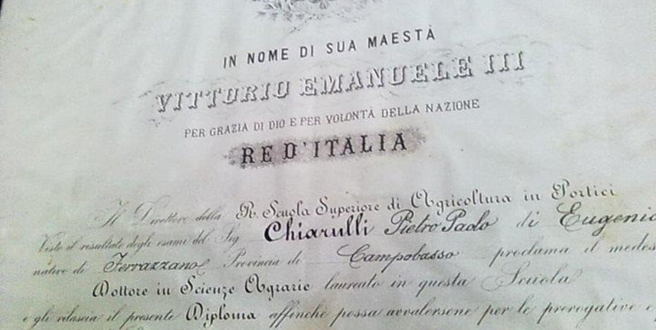 Copia del diploma oficial que certifica el doctorado en Ciencia Agraria de Pedro Pablo Chiarulli en su tierra natal, Italia. Al poco tiempo de recibirse emigró a la Argentina, donde cimentó una destacada trayectoria como investigador y docente.