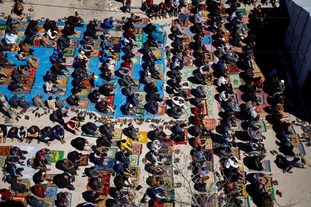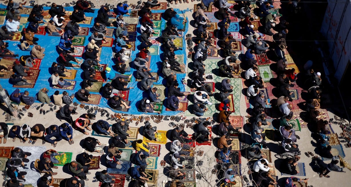 Palestinos realizan las oraciones del primer viernes durante el Ramadán cerca de las ruinas de una mezquita destruida en el sur de la Franja de Gaza, este 15 de marzo. Foto: Reuters