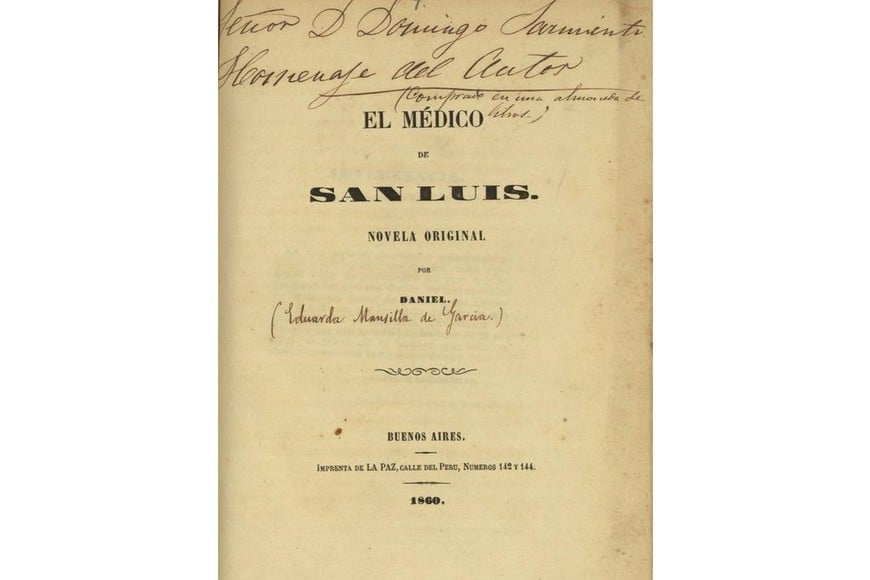 Portada de "El médico de San Luis" de Eduarda Mansilla, con dedicatoria dirigida a Domingo Sarmiento. La autora hizo uso de un seudónimo masculino.