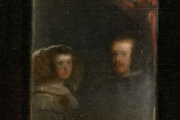 Sobre la pared del fondo, el espejo imperfecto reproduce las imágenes de Felipe IV y Mariana de Austria, reyes de España, durante una visita al salón donde Velázquez pintaba a su hija, rodeada de acompañantes.