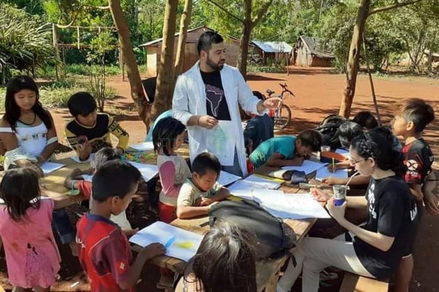 - Depende mucho del clima. No es lo mismo ir a Cauí Porá que me queda a 8 horas de viaje que irme a Iberá Potí que me queda a 60 minutos. La planificación se basa en el clima y la disposición de algún vehículo. Ya sea que nos presten un caballo, que nos levanten en la ruta, que alguien nos espere en la colonia; coordinamos eso a través de la radio. Me levanto a las 5 de la mañana (…) Ahí cargo la mochila al hombro. Muchas veces me puede acompañar Yanina Rossi que es mi pareja pedagógica (profesora de educación especial) con la que construimos este camino y es mi referente de guaraní. En invierno, todavía es de noche cuando arribamos al paraje (…) Hacemos dos dinámicas diferentes: alguna vez, casa por casa, los proyectos pedagógicos individuales; y algunas son actividades grupales comenzando tipo 8 de la mañana y, a veces, terminando 7 de la tarde. ¿Qué se trabaja? Depende mucho de las problemáticas sociales. Recientemente tuvimos acá una temporada de incendios en Misiones y se trabajó la prevención de los incendios; trabajamos la prevención de: Dengue, Leishmaniosis, Coronavirus, Sarna, Rabia. Trabajamos: educación sexual integral; la prevención del abuso más allá de la alfabetización inicial; y, en los niños con discapacidad, procesos terapéuticos pedagógicos.