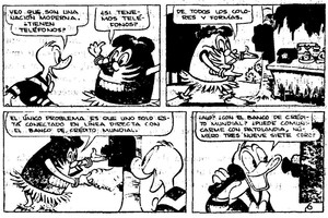 ¿Qué hacen Donald y su Tío Rico (cuyo nombre original en inglés, Scrooge McDuck, está inspirado en Ebenezer Scrooge, el personaje avaro y egoísta de “Un Cuento de Navidad” de Dickens) en ese país del Tercer Mundo? ¡Viven aventuras en busca de oro! Un mapa o un pergamino o un testamento los conducen a una exótica zona alejada de la metrópolis donde viven “buenos nativos” (buenos salvajes) que “duermen” sobre montañas de oro que ignoran o no valoran. Los patos “maman” la leche de oro que la tierra ofrece; son devoradores de tesoros (aureófagos); se apropian de riquezas que juegan a las escondidas y que su astucia desentierra; transforman esas joyas en dólares: “oro” inodoro, sin patria y sin historia que engorda la cuenta bancaria de los patos (“la disneylandización es una dinerización”).