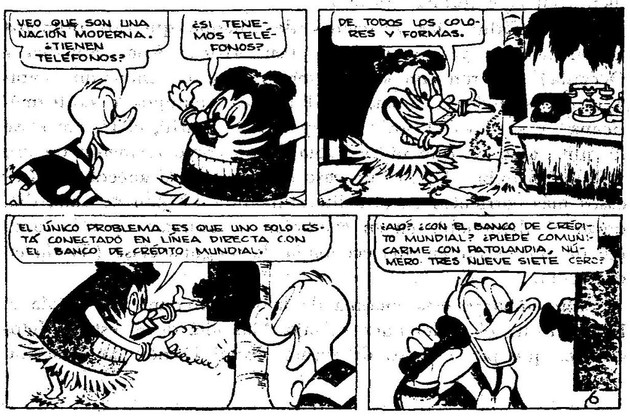 Según esta investigación, las aventuras de Patolandia muestran qué piensan y cómo nos piensan los productores de contenidos de la metrópolis estadounidense: “La amenaza no es por ser portavoz del american way of life, el modo de vida del norteamericano, sino porque representa el american dream of life, el modo en que los EE.UU. se sueña a sí mismo, se redime, el modo en que la metrópoli nos exige que nos representemos nuestra propia realidad, para su salvación”. Veamos un ejemplo, en el capítulo III (“Del buen salvaje al subdesarrollado”) se citan las siguientes viñetas: