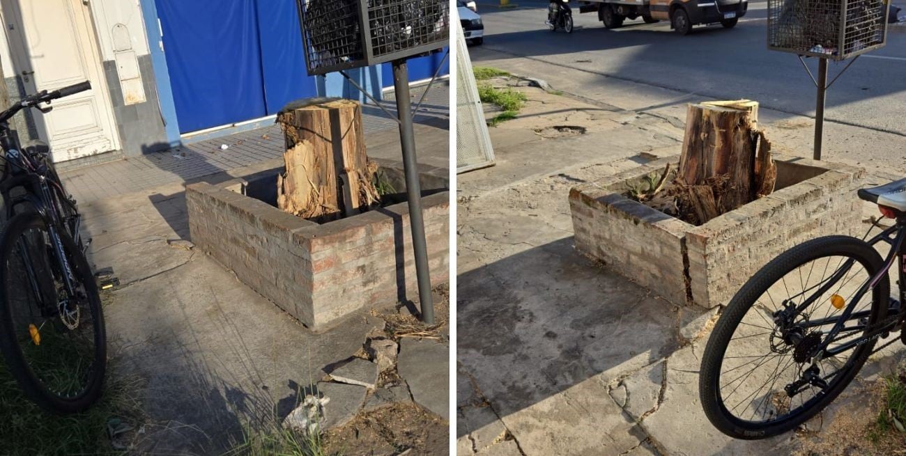 "En Facundo Zuviría y Huergo: ¡es vergonzoso lo que ha hecho un vecino… ¡No respeta nada! Se puso a talar árboles jóvenes y sanos de la vereda... ¿¡Cómo es posible que se tomara la atribución de hacer eso!? Los demás vecinos quedamos atónitos. Y, por supuesto, la Municipalidad siempre ausente. Es necesario que alguien venga a ver este desastre. En la foto se observa cómo quedó un arbolito que era hermoso: lo empezó a talar el sábado a la tardecita noche y ahora apareció cortado del todo. Tengo más fotos y videos. ¡Un desastre!".