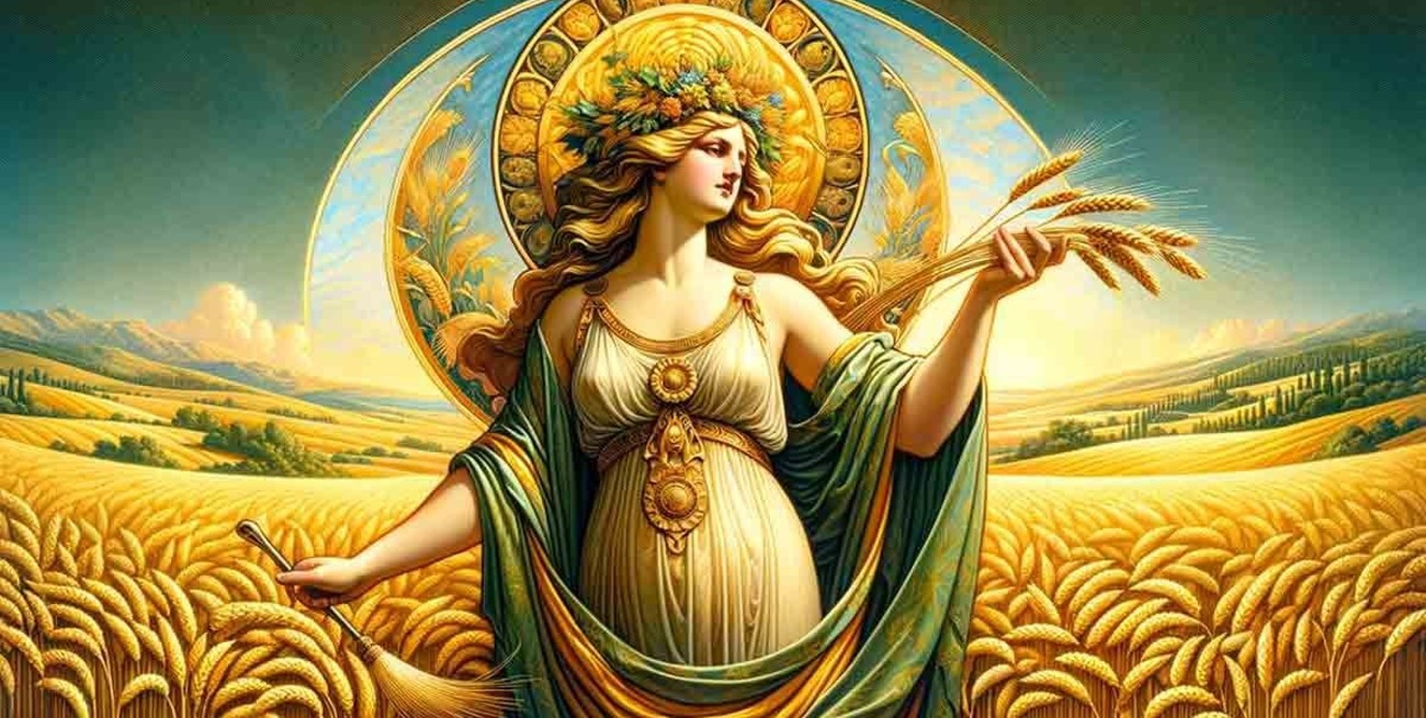 Deméter es la hermosa de larga cabellera rubia, como los trigales que protege, poderosa diosa del Olimpo, la que fecunda los campos, la que cuida las cosechas, protectora del matrimonio y de los nacimientos.