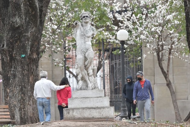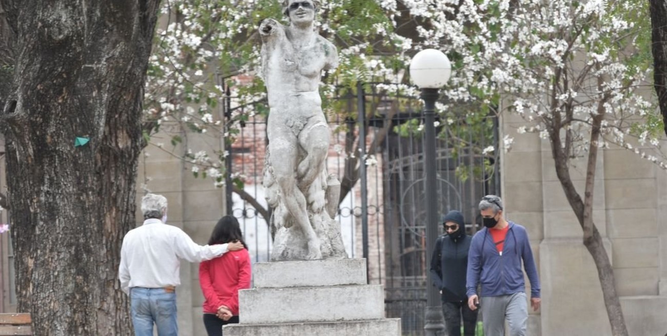Sábado 7 de noviembre. Cuando me acomodo en la vereda del bar de la esquina de bulevar y Alberdi, son las 11:18 de la mañana. Día de sol. Apenas una nubecita blanca en el cielo. Pido un café cortado y una botella de agua mineral. La plaza la observo ahora desde el ángulo izquierdo. El bulevar y los canteros con dos palmeras levantadas en cada esquina. Al frente, la Plaza Pueyrredón. A un costado, una estación de servicio. En un primer plano bulevar y los canteros recorridos por amigos de la vida al aire libre. Más allá, la arboleda de la plaza y los puestos artesanales con toldos blancos. Un señor excedido de peso con remera bordó cruza bulevar con una bolsa que contiene verduras y manzanas verdes. Lleva barbijo, pero caído. Una camioneta gris se estaciona sobre la vereda de bulevar y limita mi perspectiva sobre la plaza. Así y todo, alcanzo a ver a una muchacha de pantalones blancos, zapatillas blancas y remera gris que sale de la plaza por calle Alberdi. Una pareja joven, los dos con short y zapatillas, camina por los canteros de bulevar en dirección al Puente Colgante.