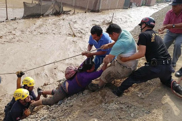 Situaciones desesperantes se viven en Perú a causa de las inundaciones. En la imagen, un grupo ayuda a una mujer a salir de la corriente en Carapongo, Lima, tras la crecida del río Rímac.