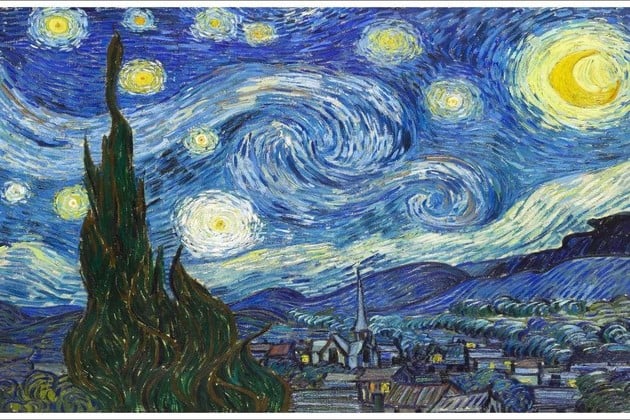 Esas olas, ese oleaje que es la noche, fue plasmado en "La noche estrellada", que Vincent van Gogh pintó en el año 1889, recluido en un sanatorio. En una carta de septiembre de 1888 dirigida a su hermano Théo, le escribió que tiene "una terrible necesidad de -¿diré la palabra?- de religión, entonces por la noche me voy afuera para pintar las estrellas (…)". En ese óleo sobre lienzo la noche es un estado de ánimo, un vertiginoso remolino con estrellas amarillas y blancas como soles, acompañadas por una luna en cuarto menguante generando ondas a su alrededor como caída en un cielo de agua, todo majestuoso sobre el pequeño pueblo y valle de Saint-Rémy-de-Provence ante la presencia de unos vigorosos y flamantes cipreses.