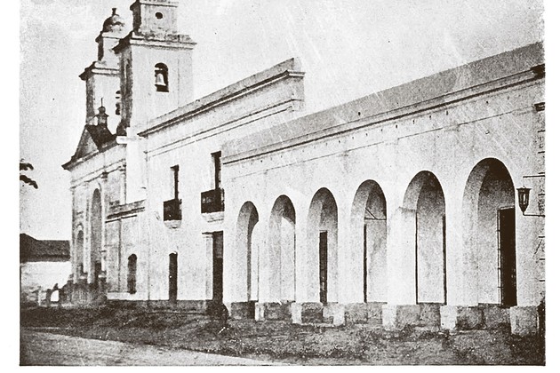 La casa de Simón de Iriondo en la versión austera proveniente del siglo XVIII, con su corredor de seis arcos, heredada de los Zavalla Comas. Al lado, la antigua casa parroquial de la iglesia matricial. Foto de Pedro Tappa tomada en 1863.
