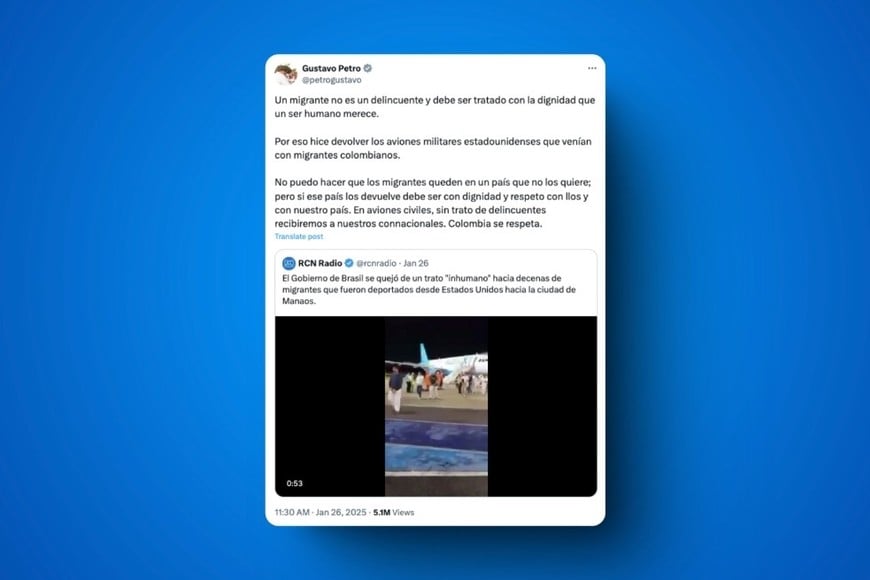 “Un migrante no es un delincuente y debe ser tratado con la dignidad que un ser humano merece. Por eso hice devolver los aviones militares estadounidenses que venían con migrantes colombianos. No puedo hacer que los migrantes queden en un país que no los quiere; pero si ese país los devuelve debe ser con dignidad y respeto con ellos y con nuestro país. En aviones civiles, sin trato de delincuentes recibiremos a nuestros connacionales. Colombia se respeta”, fue el tuit con el que comenzó el incendio.