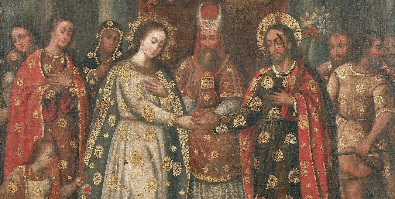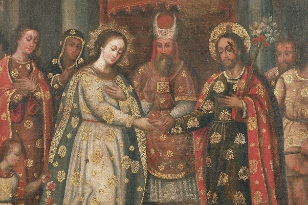 En la ceremonia de "Los desposorios de la Virgen", las orlas, flores y arabescos de oro líquido resaltan las vestiduras de los contrayentes, del religioso que celebra la boda y de los partícipes de la escena. La preciosa sustancia también compone las aureolas de María y José. José G. Vittori / Museo Histórico Provincial.