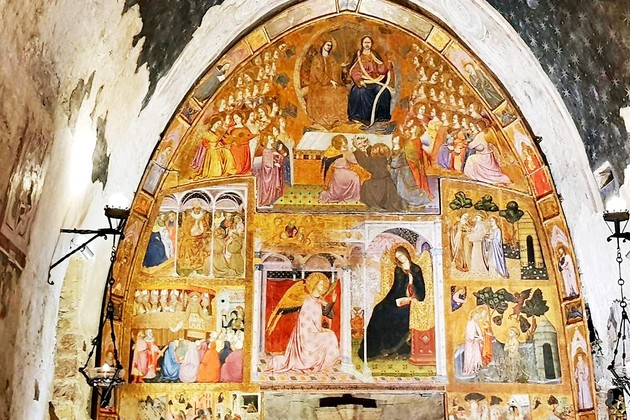 Por esas razones, ese lugar mínimo se convirtió en un gran centro religioso, y a lo largo de los siglos fue refaccionado y ornamentado. Distintos artistas dejaron su impronta en frescos murales, como el ignoto monje Hilario de Viterbo, quien, en 1393, pintó en clave gótica el colorido retablo mural, en el que se destaca una escena de la Anunciación de la maternidad a María y, encima, dentro de una característica "mandorla" medieval, las figuras de Jesús y la Virgen. Siguiendo el sentido ascendente de los arcos ojivales del techo, en la parte frontal, un templete gótico que contiene una escultura de la Virgen con el Niño, se estira hacia la cúpula de la gran basílica, representativa de la bóveda celeste.