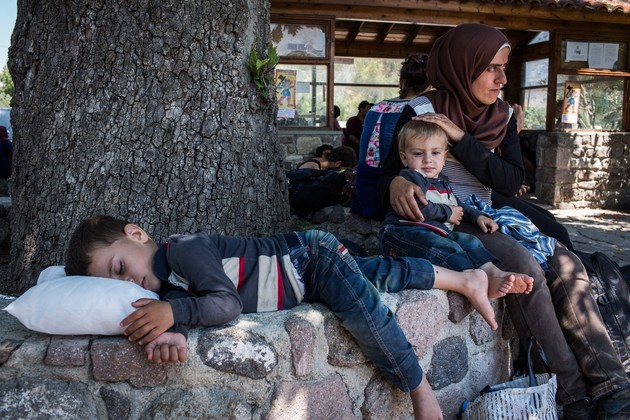 Una madre refugiada y sus dos hijos descansan después de su llegada a la isla griega de Lesbos. Muchos de ellos provienen de Medio Oriente; no son simples migrantes, son desterrados, víctimas de la guerra.