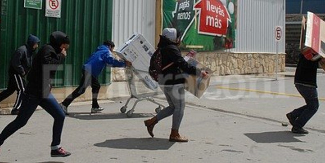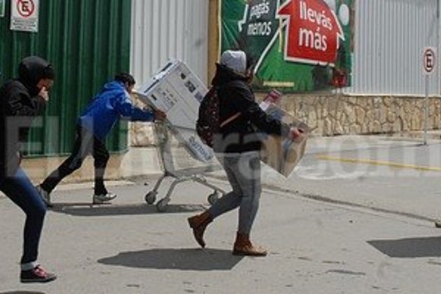 Un grupo de saqueadores huye, con bienes robados a un supermercado, ante la llegada de la policía. Foto: dyn