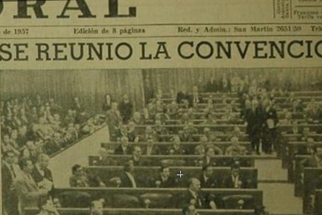 Primera plana de diario El Litoral del 30 de agosto de 1957. El título destaca el hecho institucional: una Convención Reformadora de la Constitución Nacional, convocada por un gobierno de facto, autodefinido como "provisional". Archivo El Litoral