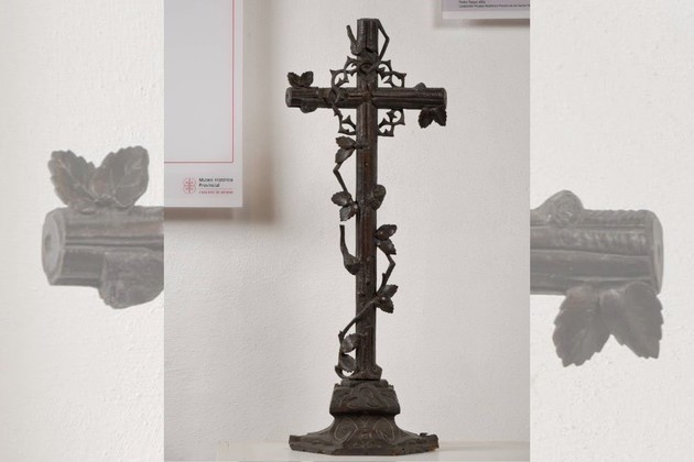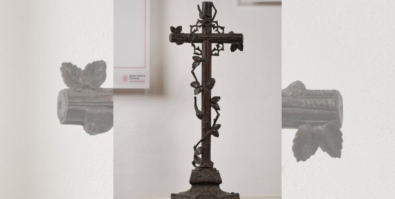 Esa cruz es tan infrecuente como la convivencia del matrimonio Paz en la prisión. Aunque se carezca de información precisa sobre su origen, puede colegirse que llegó a la celda en manos de Tiburcia Haedo o de Margarita Weild. Es una pieza extraña, fitomórfica, de un barroquismo moderno en su estilización. Semeja un trabajo rústico, al punto que el imaginero se propuso mostrar los palos vertical y transversal de la estructura crucífera como troncos de madera con su corteza, y enroscar en el larguero principal el tallo de un rosal que asciende desde la base o pie de la composición. Se trata de una imagen naturalista que se refuerza con la talla secuenciada de hojitas dobles y las salientes de unos muñones de ramas malogradas. En el epicentro de la cruz, el lugar que ocupara la cabeza lacerada de Cristo es sugerido por una corona de espinas con caladuras.
