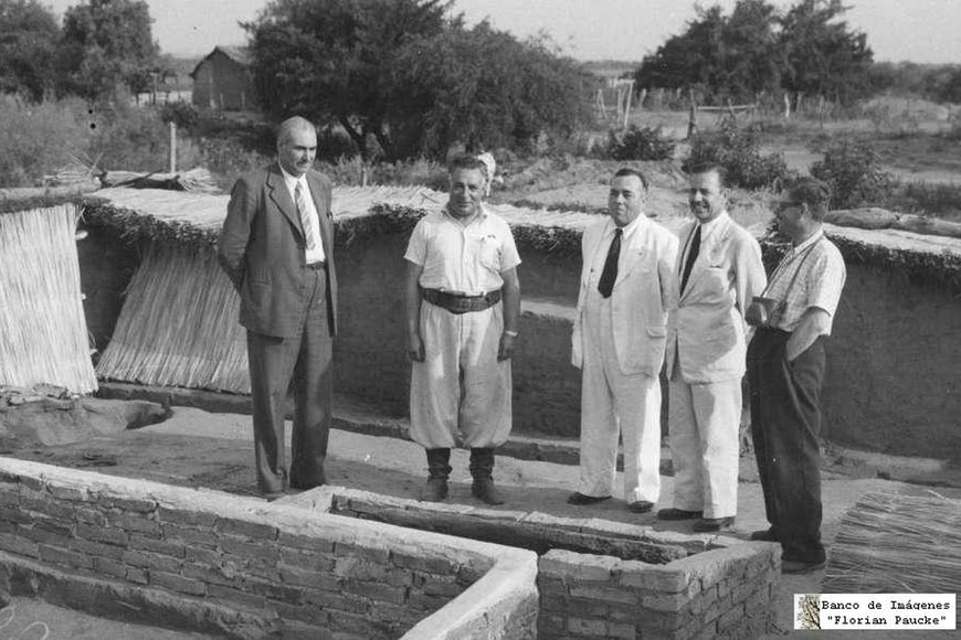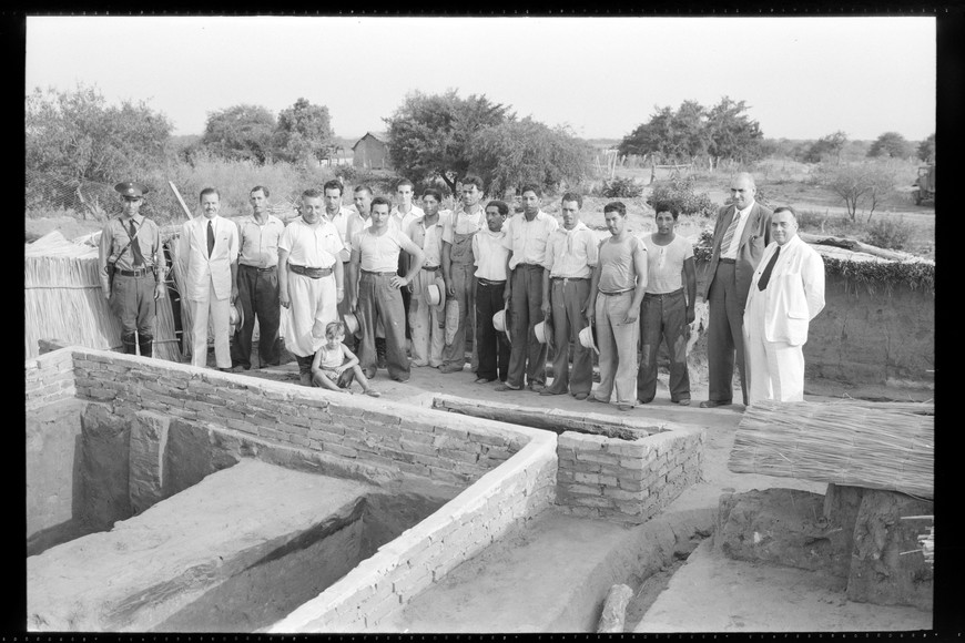 Equipo de trabajo. Agustín Zapata Gollán (con bombacha criolla) es acompañado en la presente imagen por su grupo de colaboradores y operarios. Sus nombres figuran en los registros llevados en prolijos cuadernos.