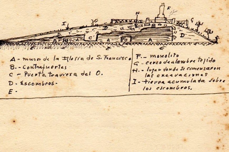En la fotografía de agosto de 1949 se puede observar una de las primeras zanjas que se hicieron en los alrededores del monolito y que permitieron localizar la iglesia de San Francisco, tal como lo ilustró Zapata Gollán en uno de los pocos croquis que se conservan. En la fotografía de febrero de 1950, ya se puede observar la estructura completa de la iglesia vista de lo que fue el ingreso principal, con los muros de tapia tapados con quincha o chapas. Se ven algunos entierros descubiertos y rodeados con pequeñas paredes de ladrillos construidas durante las excavaciones para su protección. Junto a una de las sepulturas cercanas al ingreso principal, se alcanza a observar una de las botellas de goma laca con las que se recubrían los huesos para evitar su deterioro. Al fondo de la imagen, a la derecha hay un trabajador caminado junto a un montículo de tierra de las excavaciones.