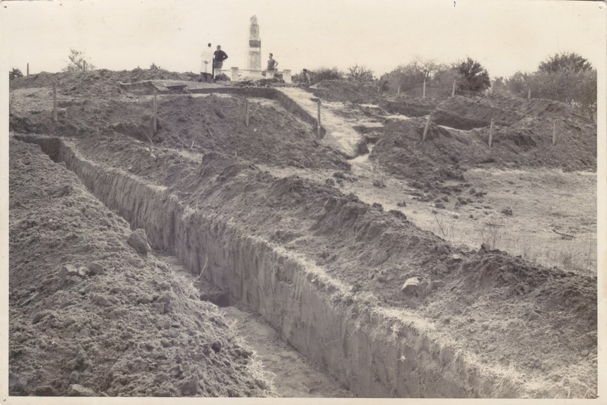 Inicios. Fotografía de agosto de 1949 en la que se puede observar una de las primeras zanjas que se hicieron en los alrededores del monolito y que permitieron localizar la iglesia de San Francisco.