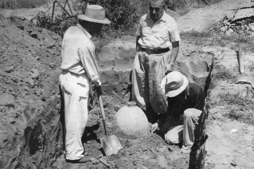 Gran apoyo. El ingeniero Víctor Nícoli (primero, a partir de la izquierda) fue el profesional que respaldó desde las ciencias exactas la labor de Agustín Zapata Gollán en el descubrimiento de Santa Fe La Vieja.
