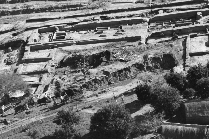 Toma aérea. Lograda en el año 1952, permite observar la estructura excavada de la iglesia de San Francisco y hacia el norte, además de algunas zanjas con indicios de nuevos descubrimientos.