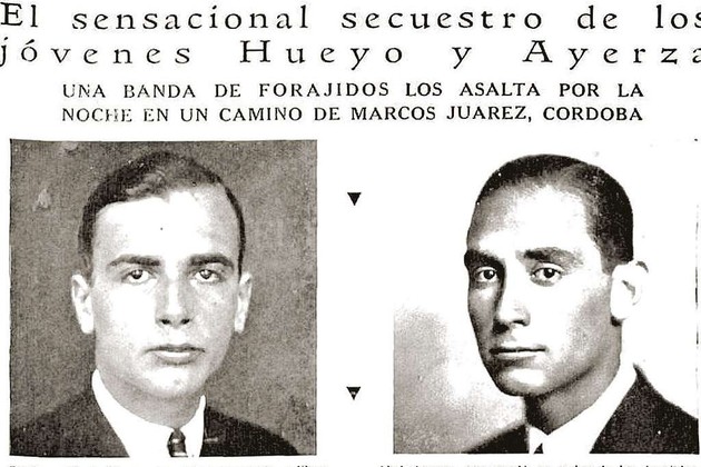 Abel Ayerza y Santiago Hueyo fueron secuestrados la noche del 23 de octubre de 1932. Los muchachos regresaban de la ciudad de Marcos Juárez adonde habían asistido a una función de cinematógrafo, como se decía entonces. Y se dirigían a la estancia El Calchaquí, propiedad de la familia Ayerza, donde estaban disfrutando de unos días de vacaciones. Los acompañaban su amigo Alberto Malaver y el mayordomo de la estancia, José Bonetto.