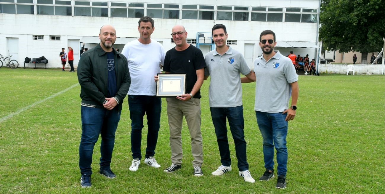 Merecido reconocimiento. Leandro Birollo hace entrega de una plaqueta a Matías Vidoz, a la izquierda, Sergio Basile y a la derecha, Herbert Basita y Fabricio Galateo. La cancha principal del predio está en excelente estado. Crédito: Guillermo Di Salvatore