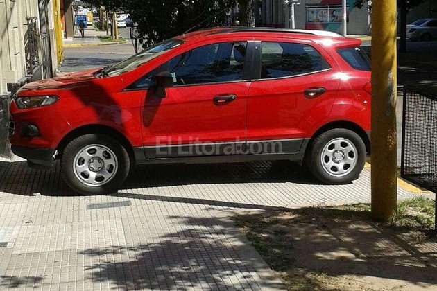 >> República de Siria al 3400: una de las fotos muestra a una camioneta Ford EcoSport roja ocupando todo el ancho de la vereda y sin dejar espacio para que puedan circular los peatones, que para poder seguir se ven obligados a bajar a la calle.