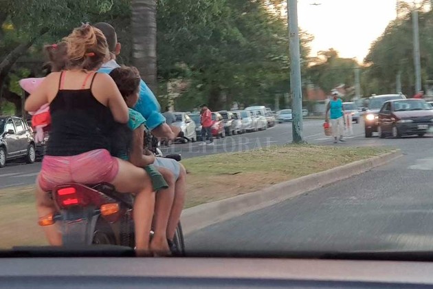 No hay mucho para agregar. Cuatro personas viajan en una moto, de las cuales dos son menores de edad, y ninguna lleva casco. El vehículo no tiene su patente identificatoria.