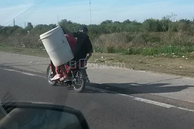 En esta oportunidad, un lector envió una fotografía que muestra cómo dos personas circulaban en una moto sin patente, ni el casco y, como si fuese poco, llevaban un lavarropas.