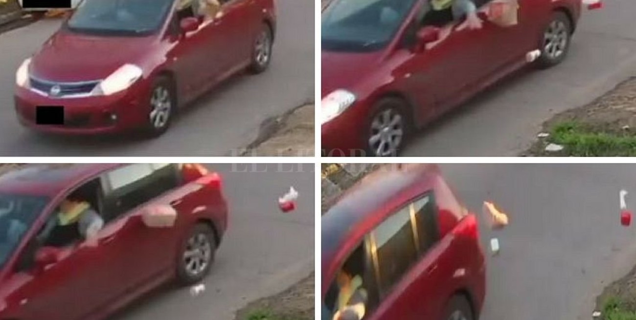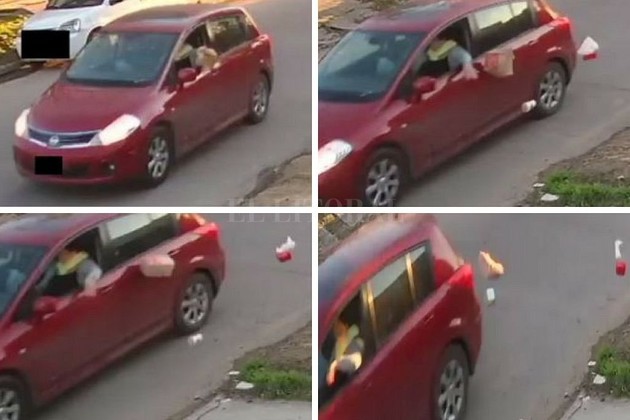 Un periodista ciudadano envió las imágenes de un conductor que este lunes por la tarde arrojó por la ventanilla de su auto y en la vía pública los desperdicios de un “tentempié” de un local de comidas rápidas.