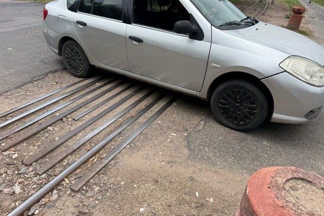 La rotura se nota en el borde del asfalto, con piedras sueltas y sectores descalzados alrededor de las vías. Automovilistas y motos deben frenar casi por completo para evitar golpes en el tren delantero o pérdidas de estabilidad.