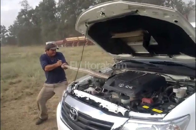 El video se viralizó por WhatsApp y muestra cómo dos hombres se arriesgan a retirar a la víbora que estaba enroscada dentro del capó del vehículo.