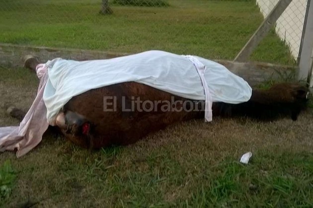 Hacia la noche del domingo, el cuerpo del pobre animal y su potrillito nonato continuaba tendido en la vereda, sin que nadie lo retire.