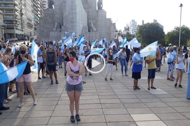 Pese a estar convocado para las 17, la mayor cantidad de público se acercó pasadas las 17.30. Muchos con la bandera argentina, precisamente hoy 27 de febrero, 209 años después del izamiento de la enseña patria justamente en este lugar. Algunos, los menos, con pancartas que rezaban, entre otras, “Abajo plandemia”, “Basta de zurdaje empobrecedor”, “Kanallas”, “No al robo a los jubilados”. Además del público que llegó a pie, una gran cantidad de vehículos, muchos con banderas nacionales, pasaron por la avenida Belgrano tocando bocina y haciéndose sentir también.
