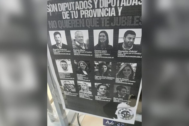 "Son diputados de tu provincia y no quieren que te jubiles", se titula el afiche colocado en el centro de Rosario y en algunos pocos en la ciudad de Santa Fe con los rostros de los legisladores con los nombres, pertenencia política y correo electrónico responsabilizándolos del no tratamiento de una nueva moratoria previsional.