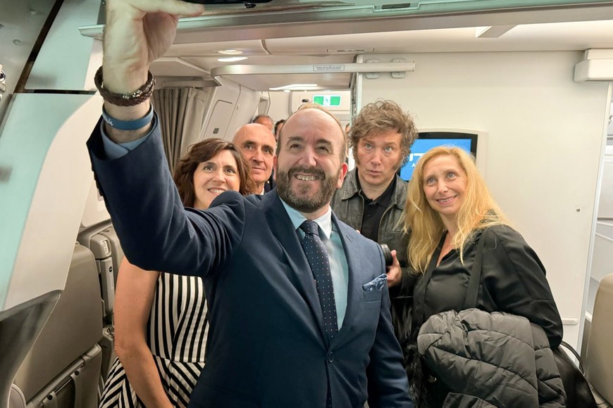 El presidente Javier Milei y su hermana Karina, con parte de la tripulación que se encuentra a bordo del avión de línea en el que partieron hacia Roma.