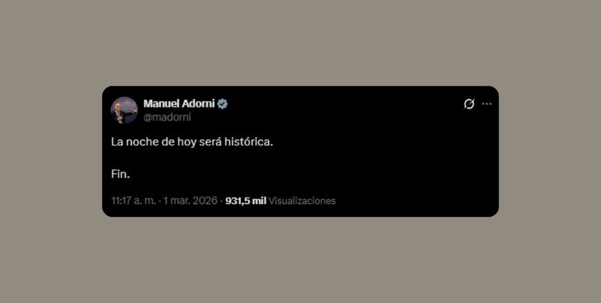 En la previa del mensaje presidencial ante la Asamblea Legislativa, el Jefe de Gabinete de Ministros, Manuel Adorni, encendió las redes sociales con una frase contundente: “La noche de hoy será histórica. Fin”. El mensaje, breve y sin mayores precisiones, multiplicó la expectativa sobre posibles anuncios durante la apertura de sesiones ordinarias.