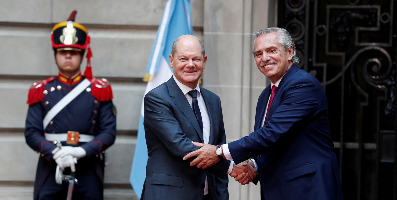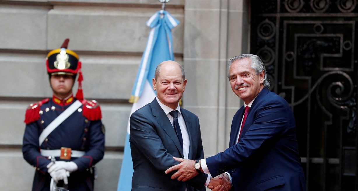 El presidente Alberto Fernández recibió este sábado en el Palacio San Martín al canciller de Alemania, Olaf Scholz, quien realiza una visita por Sudamérica que incluye Brasil y Chile, y tiene como objetivo ampliar el comercio bilateral, el flujo de inversiones y el financiamiento de proyectos.
